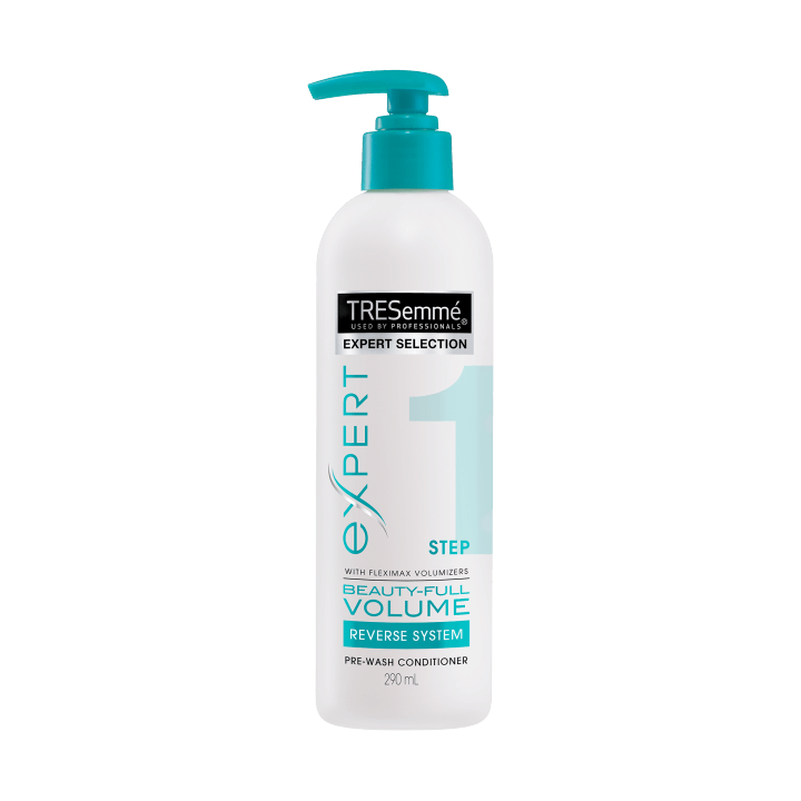 1.Smooth 2-3 pumps of TRESemmé Beauty-Full Volume Pre-Wash Conditioner through wet hair, and let it work its magic for a minute or so.